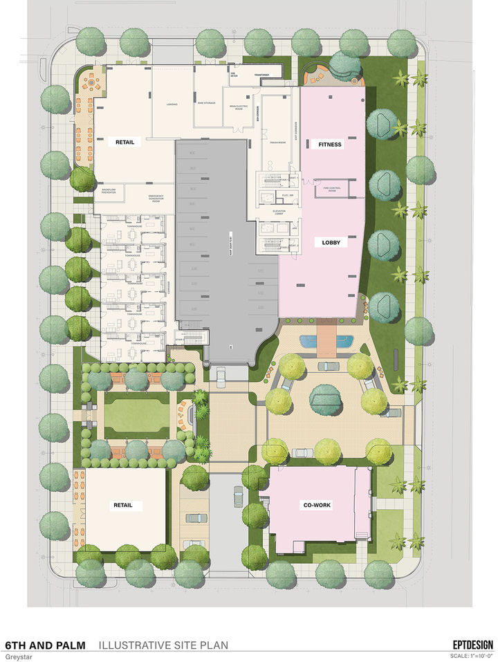 At ground level, 6th & Palm creates a welcoming streetscape where interior amenity spaces, including the lobby, lounge, co-working areas, and fitness center, connect directly to the sidewalk through large expanses of glazing. The development provides enhanced landscaping, a free-standing retail pavilion, a second retail space, and five two-story live/work units with front entry porches along 5th Avenue, adding to the neighborhood’s vibrant and growing mixed-use energy.
